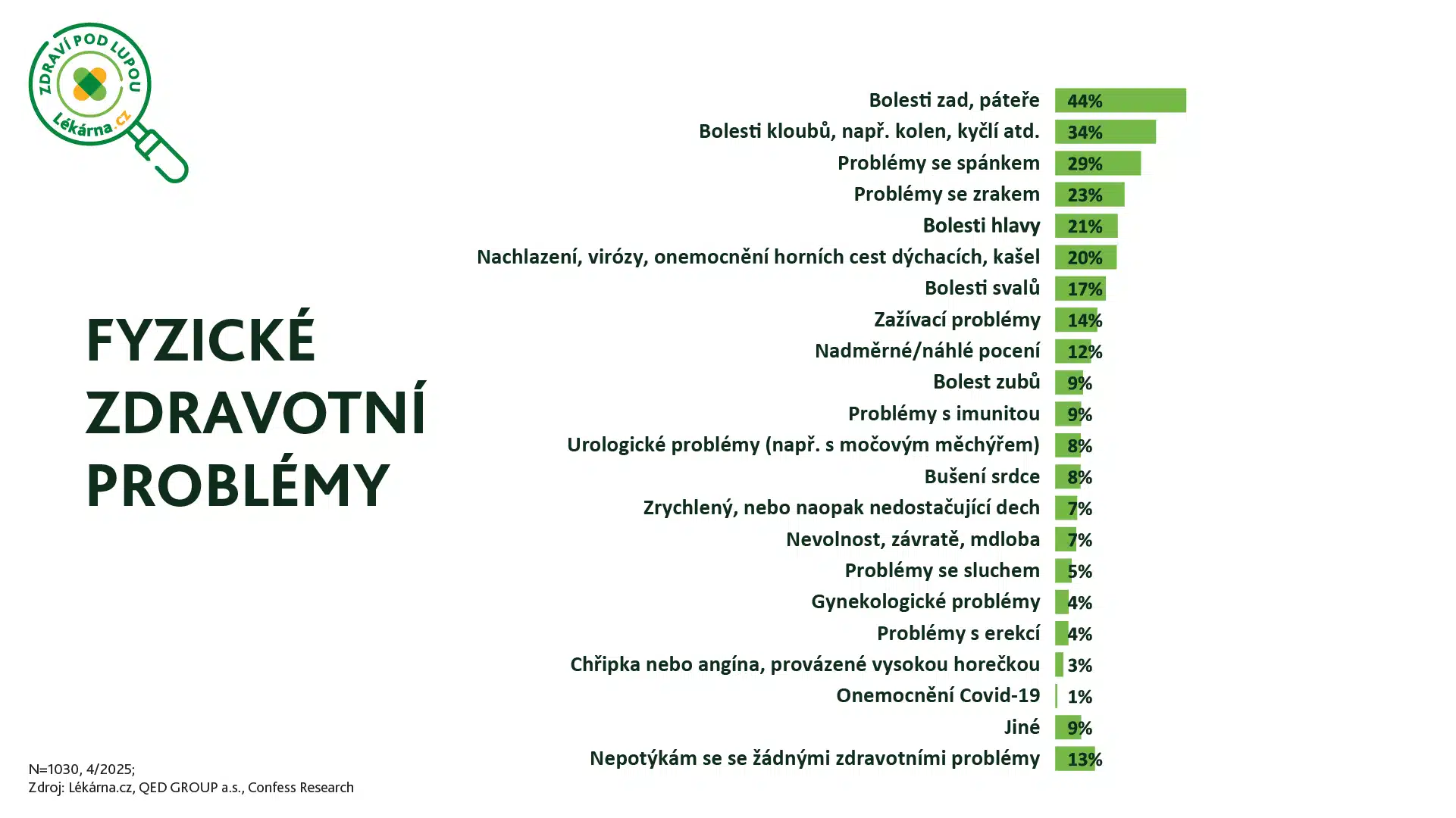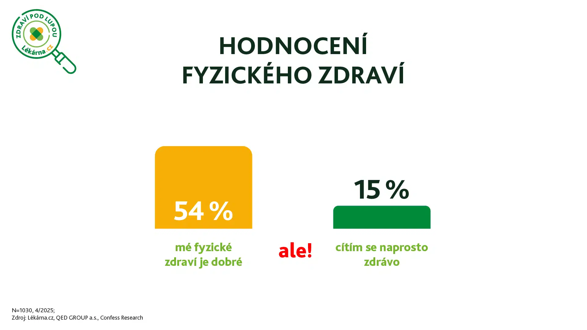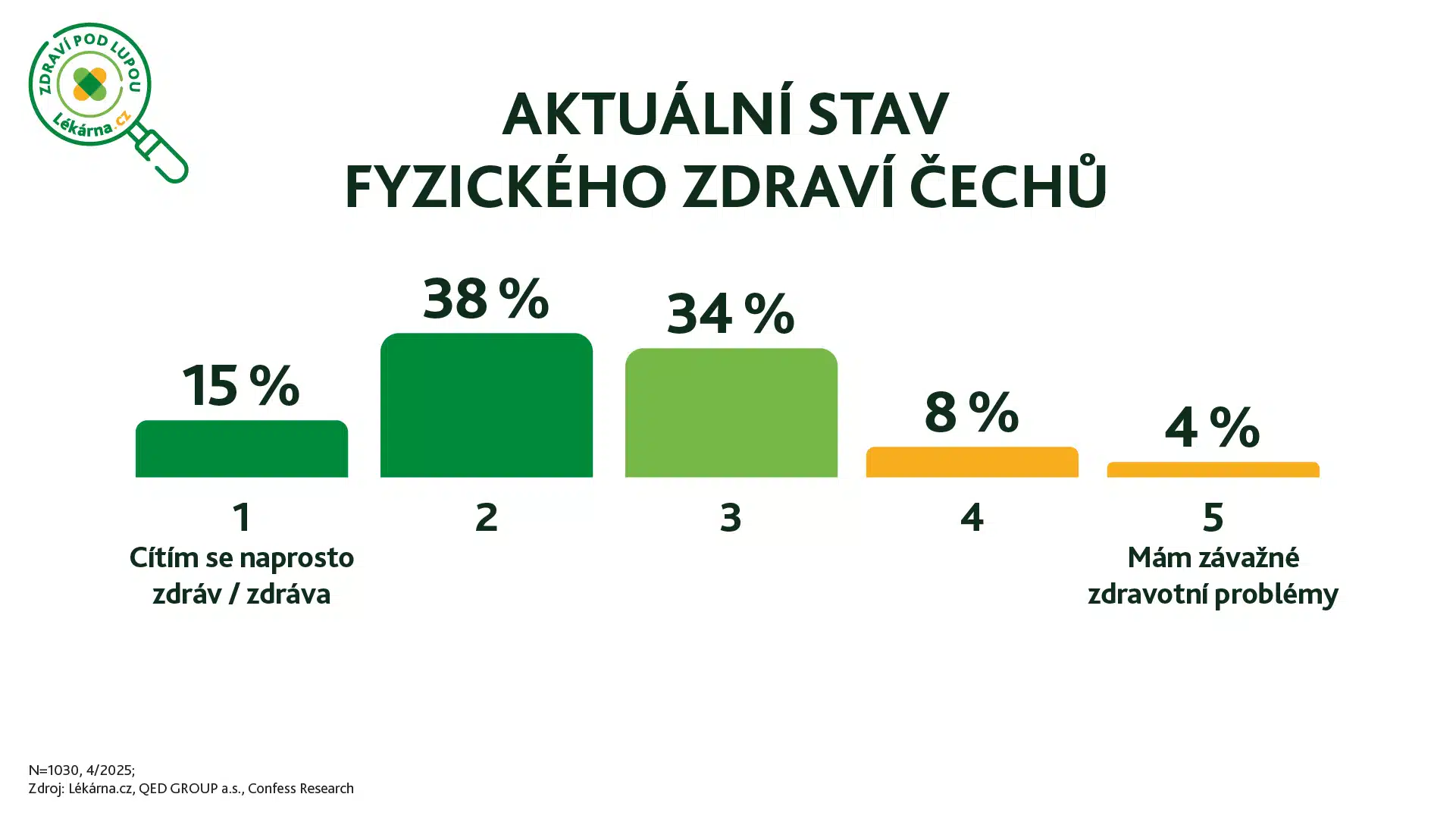 Aktuální stav fyzického zdraví Čechů podle výzkumu Zdraví pod lupou Lékárna.cz 2025.