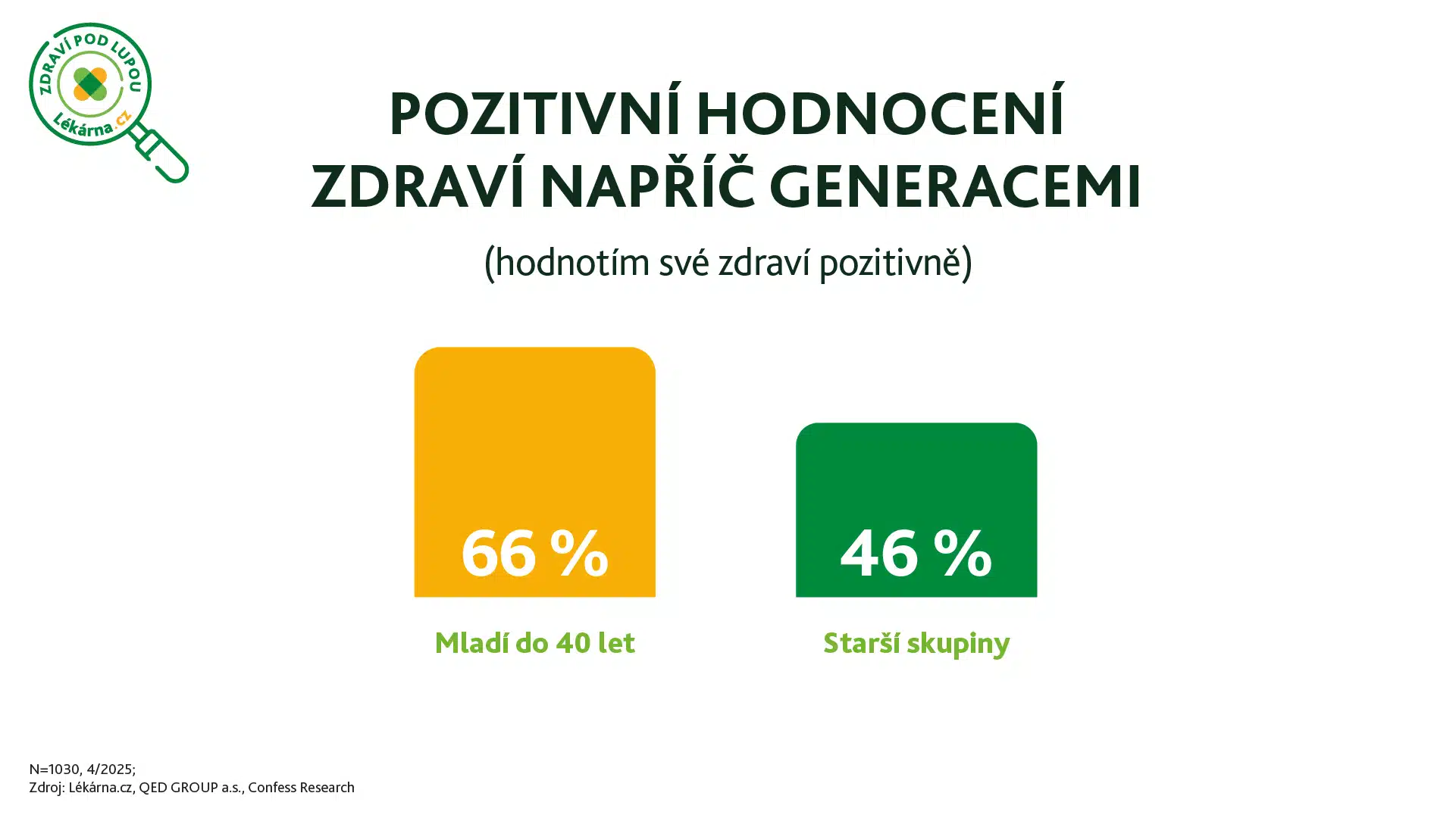 Mladší lidé hodnotí své fyzické zdraví výrazně pozitivněji než starší generace – 66 % vs. 46 %. Jeden z meziročních rozdílů, který ve streamu rezonoval.