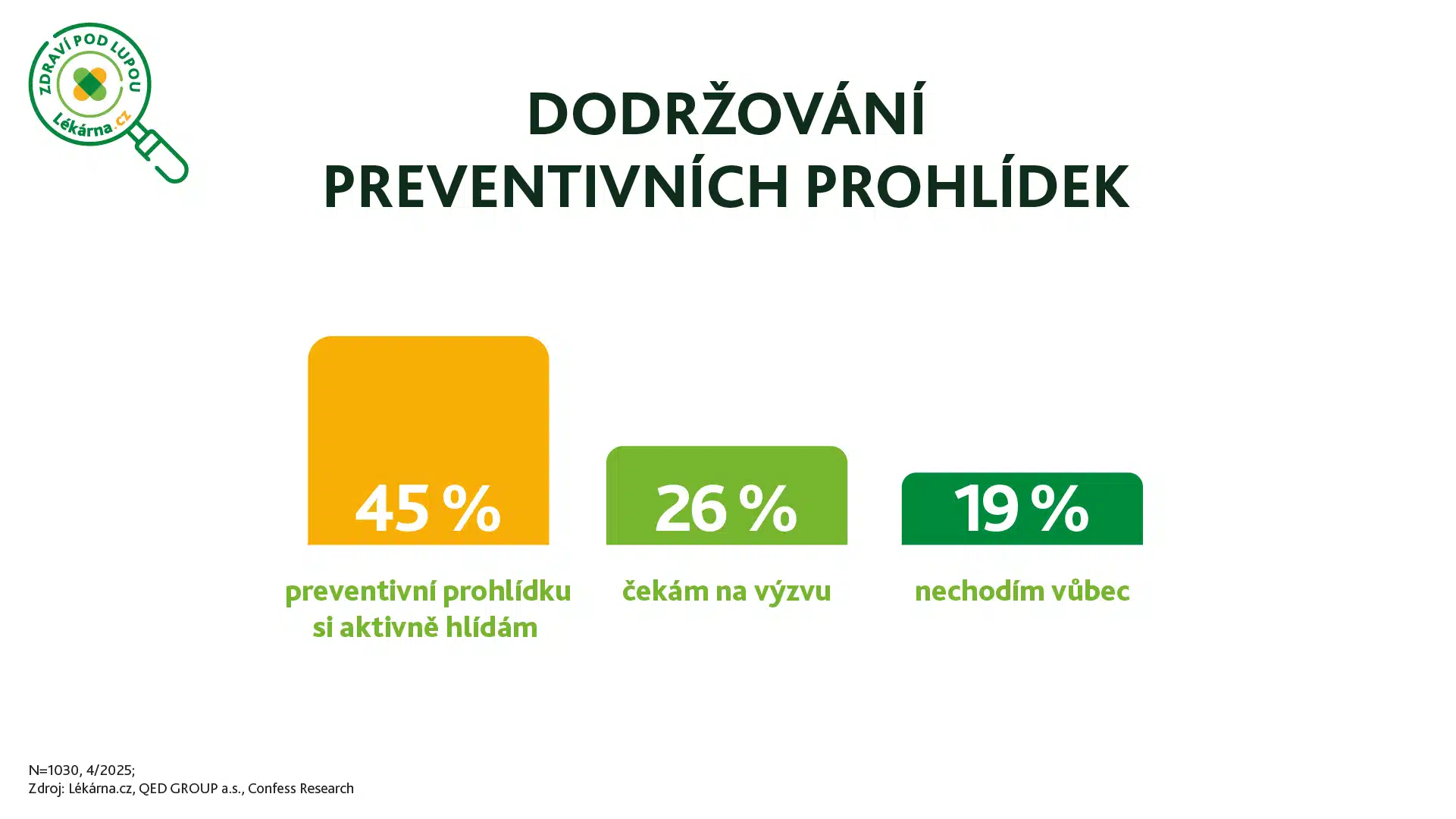 Jak Češi dodržují preventivní prohlídky: 45 % si je aktivně hlídá, čtvrtina čeká na výzvu a téměř pětina nechodí vůbec.