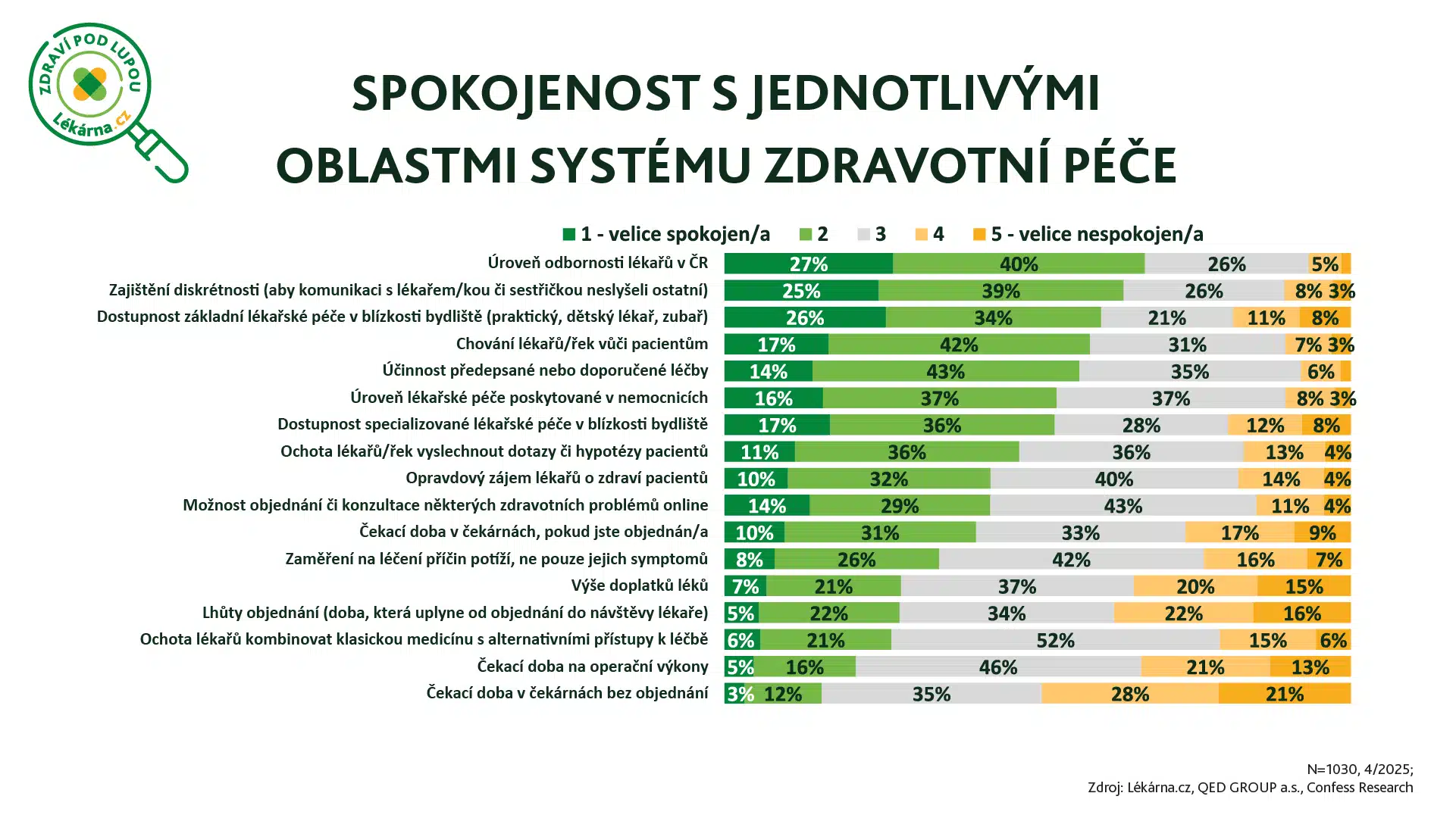 Detailní pohled na to, jak Češi hodnotí jednotlivé oblasti zdravotní péče — od odbornosti lékařů až po čekací doby.