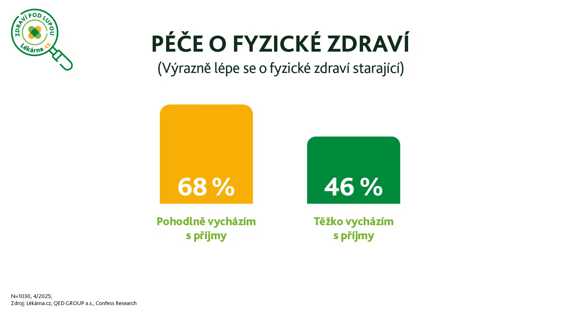 Lidé, kteří s příjmy vycházejí bez potíží, pečují o své fyzické zdraví výrazně častěji (68 %) než ti, kteří vycházejí obtížně (46 %).